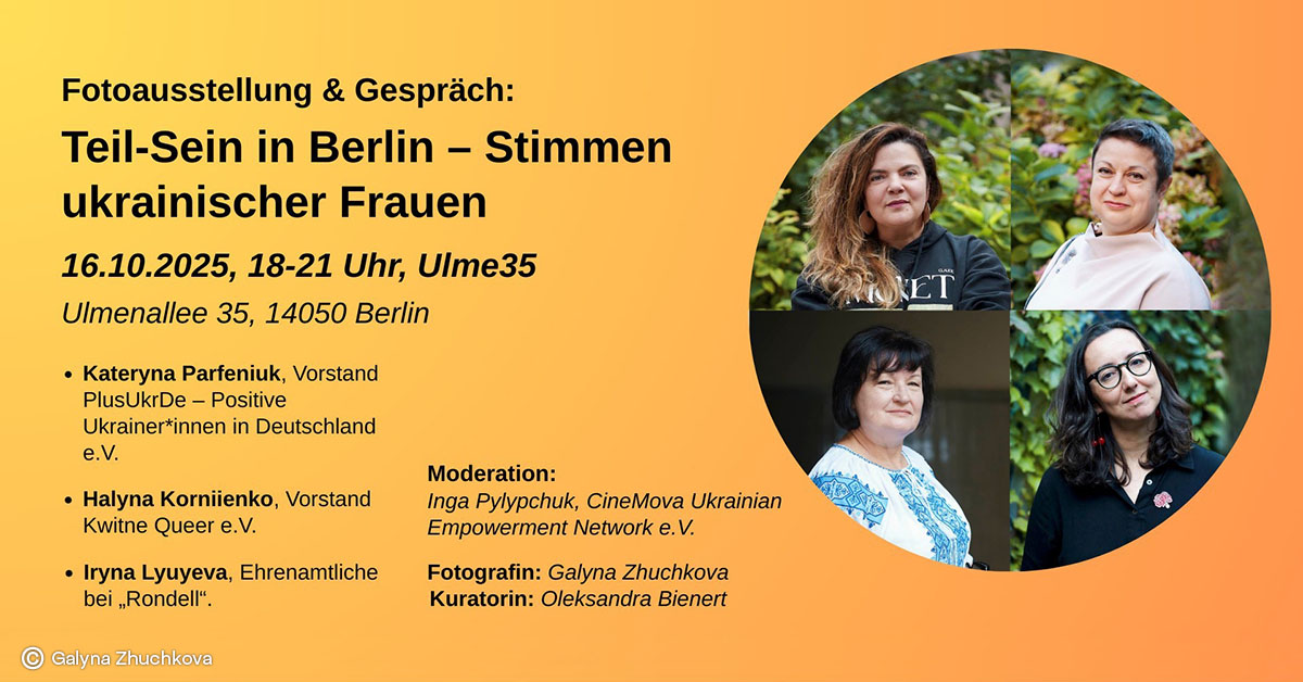 Die Veranstaltung findet im Rahmen des Projekts „Teil-sein. Handlungsorientierte Teilhabe von Geflüchteten aus der Ukraine in Berlin“ statt und ist mit der Fotoausstellung „Kraftvolle Stimmen: Die Rolle ukrainischer Frauen im Leben Berlins“ verbunden. Die Ausstellung zeigt 23 Porträts und Geschichten engagierter Frauen aus der Ukraine – Abgeordnete, Aktivistinnen, Wissenschaftlerinnen, Unternehmerinnen, Lehrkräfte und viele mehr. Die Fotografien von Galyna Zhuchkova machen sichtbar, wie Ukrainerinnen das gesellschaftliche, kulturelle und politische Leben Berlins mitgestalten. Sie lädt dazu ein, politische Teilhabe als gemeinsamen Raum zu begreifen, der für alle wichtig ist – unabhängig von Herkunft oder Aufenthaltsstatus.